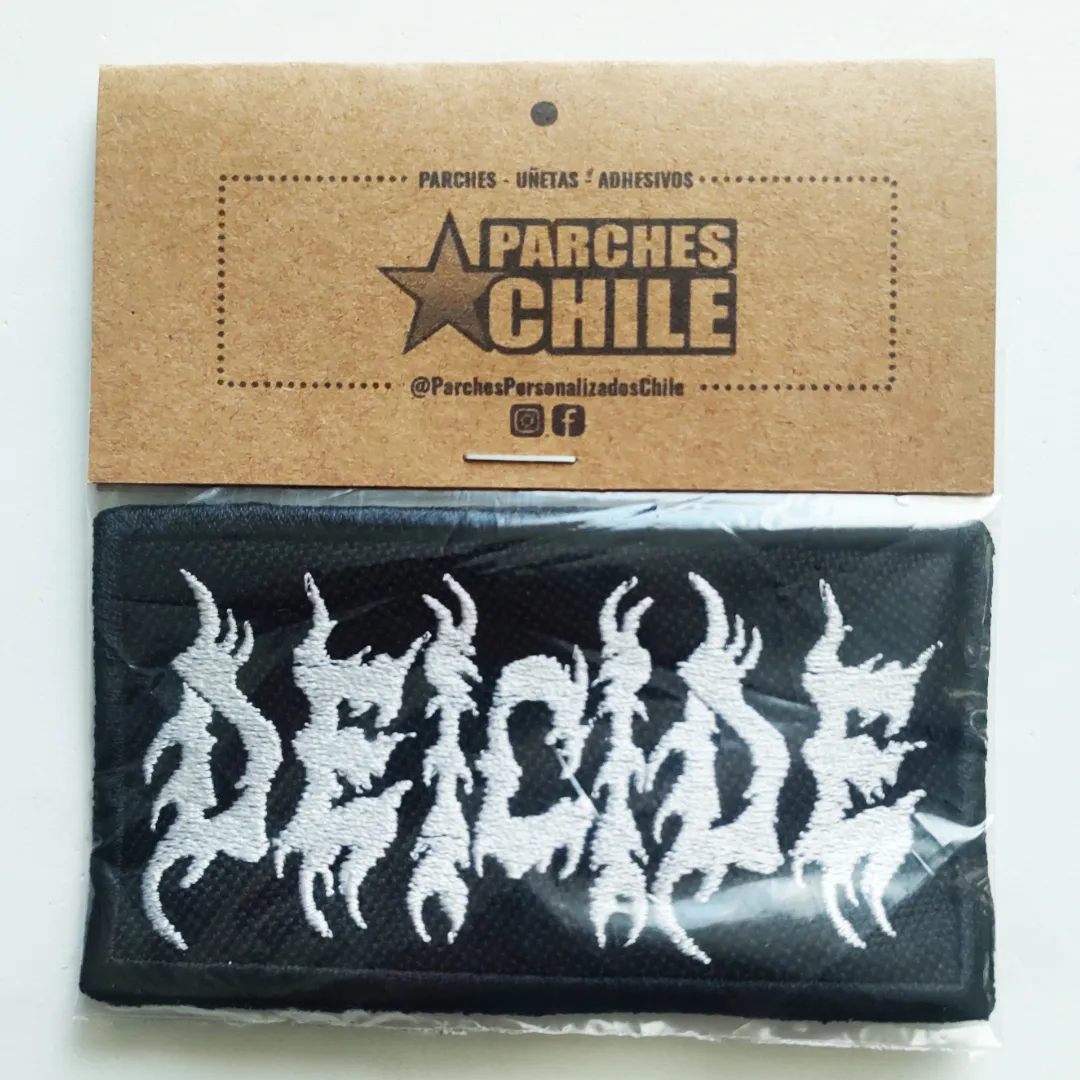 Parche Bordado con diseño de la banda de Deicide, de un tamaño de 9x5 cm ideal para coser en chaquetas de mezclilla.