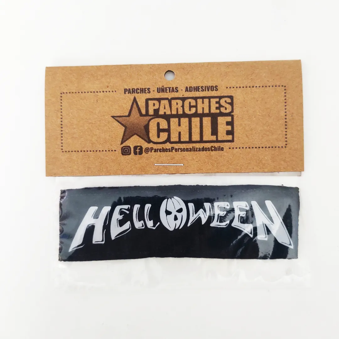 Parche estampado con el logo de la banda de metal Helloween en color blanco sobre tela negra